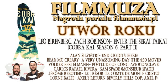 Na rzecz serialu Cobra Kai duet Leo Birenberg i Zach Robinson skomponowali masę dobrej muzyki, która już wcześniej była nominowana do Filmmuzy. Do ostatniego, finalnego sezonu serialu stworzyli tak przebojowy kawałek pt. Enter the Sekai Taikai, że aż znalazł się u nas na podium jako Utwór Roku! Dalsze utwory, które znalazły się u nas na liście, pokrywają się w dużej mierze z pracami nominowanymi w kategorii Score Roku. Co jest logiczne, wszak najlepsze ścieżki dźwiękowe roku, powinny mieć też najlepsze Utworu Roku. Poza kawałkami z 4:30 Movie, Conclave i Here doceniliśmy także piękne Le Trésor z The Count of Monte-Cristo Jérôme Rebotiera. W klimatów filmów noir przeniósł nas jazzowy Sam Spade Carlosa Rafaela Rivery z mini-serialu Monsieur Spade. Listę zamyka kolejny przebojowy, utrzymany w stylu lat 80. kawałek Axel’s F Return Lorne Balfe’a do Beverly Hills Cop: Axel F.