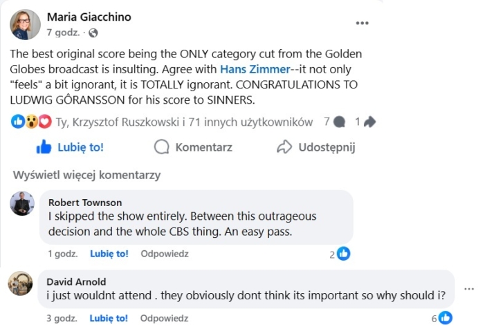 P.S. Plus jak widać organizatorzy Złotych Globów zdecydowali się zamieścić wyłącznie przemówienie zwycięzcy pomijając nawet wzmiankę o reszcie nominowanych kompozytorów.